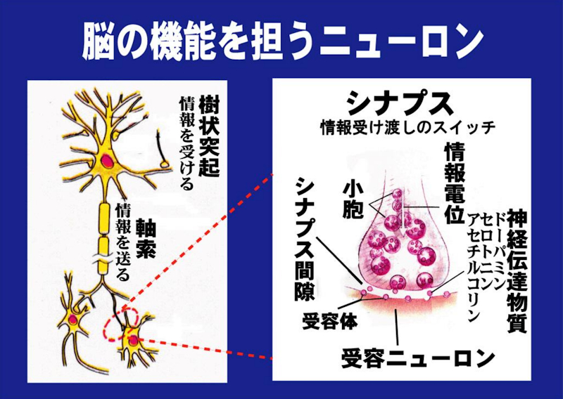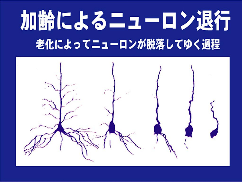 脳は数億個もあるといわれる神経細胞(ニューロン)の集まりでできていて、ニューロン間の情報交換により、記憶、認識などの脳機能を維持しています。加齢とともにニューロンは退化・脱落していきますので記憶力の低下などが始まります。40代、50代になると脳の鋭敏さが失われていることに気付くことが多くなります。