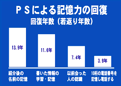 最近「神経学」誌に発表された研究報告では、正常な老化に伴う記憶障害をもつ五十歳から七十歳までの健康な男女149人を対象に、毎日100グラムのPSと偽薬を12週間にわたって投与しました。PSグループは、電話番号や顔や名前を記憶する力や、文章を記憶する力、間違い探しを解くスピードや集中力などが著しく向上しました。一方、偽薬グループには際だった変化は見られませ んでした。